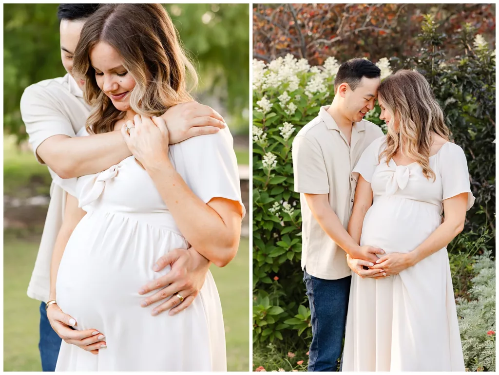 This location offers such a relaxed, natural setting for your photos. The gardens are easily walkable (a big win for expecting mamas!), and you don’t have to go far to find variety. For this session, we started in one quiet area and found several beautiful spots with soft light and lush backgrounds. Our final part of the session was in one of my favorite corners of the gardens with the last bit of golden sunlight.