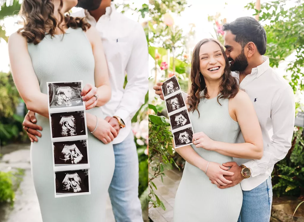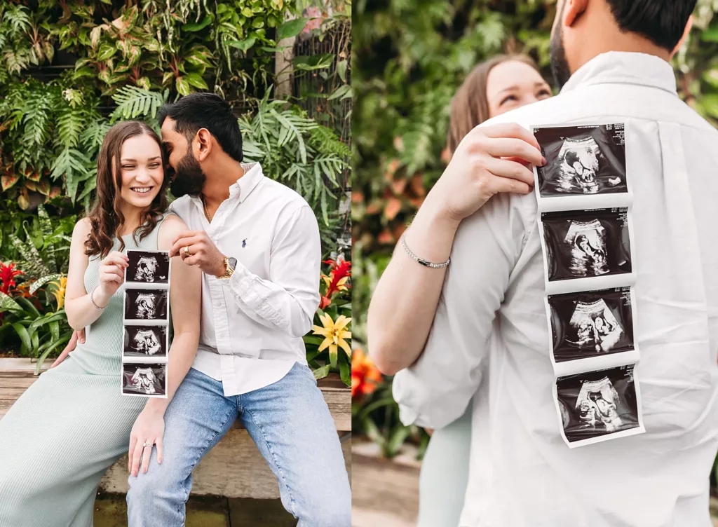 Most couples book their pregnancy announcement photo session around 8–12 weeks, once they’ve had their first appointment and feel ready to share the news. Some wait a little longer, especially if they want to show a little baby bump or pair it with a fun announcement.
